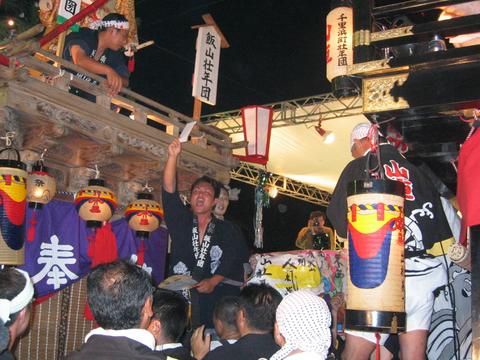 | 山車の激突(飯山と千里浜)---3 花代をもらい読み上げる飯山壮年団員 |