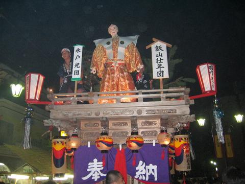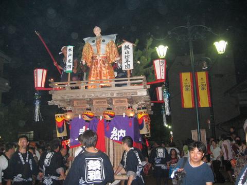 飯山の山車(ヤマ) 毎年、山車上部に飾る武者人形は変わるが 今年は「水戸光圀公」を飾っていた。多数の笛 と太鼓、三味線で「オチャヤマ ミテクレ ミテ クレミーテクレ」とうたを唄いながら山車をアピ ールしていた |