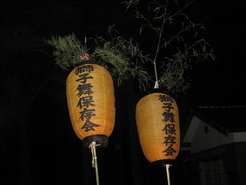 井田の秋祭り ---1 下井田の獅子舞保存会の高張提灯で場内 を照らす |