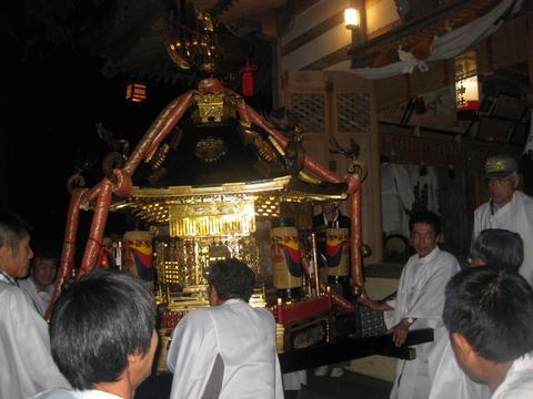 井田の秋祭り---2 神社参門前では神輿、獅子舞の宮上がりが 行われた。 |