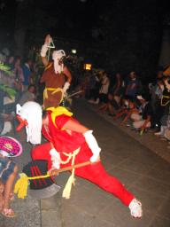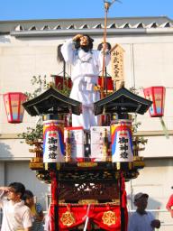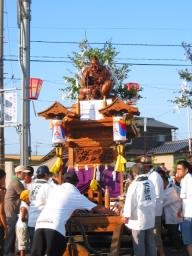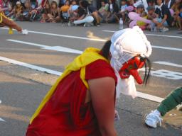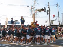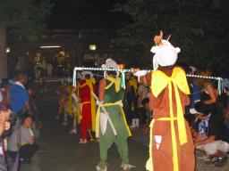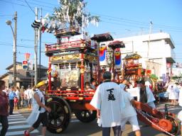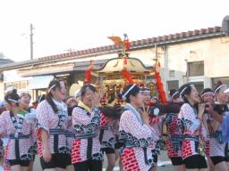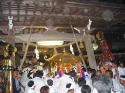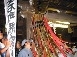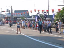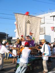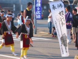 | 大野湊神社夏祭りで2007年は8月 3・4・5日に開催された。3日目は御 輿(神様)が仮宮から本宮にご帰還す る日でお見送りには子供鼓笛隊、よ さこいチーム、各町太鼓台車、各町 山車、子供奴振り、米持ち上げ保存 会、悪魔払い、女御輿と行列して御 輿を見送った。 |