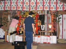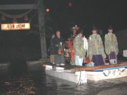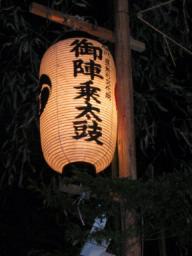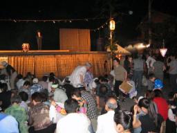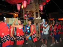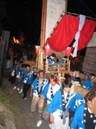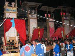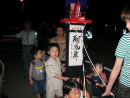 (二)名舟町内の五地区のキリ コ五基とみこし一基が町内を 巡行た後、奥津姫神社広場に 集結。午後十時半すぎから 太鼓の競演を開始、子ども組 から特設舞台に上がった。 |
