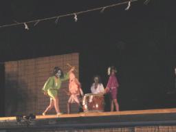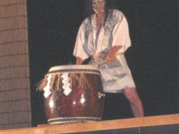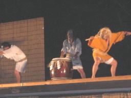 (三)太鼓の保存会メンバーは、かがり 火が燃え盛る中、登場。野良着に腰縄 をまき、海藻で作った髪を振り乱し、怒 声やうめき声など奇声を発しながら、 乱れ打ちを披露した。時折見えを切り、 舞台を思いきり踏み鳴らして回し打つ 光景は迫力十分。 |