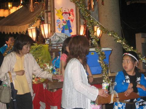 女良湊町のキリコ---1 A互市祭では、浜通り、川淵、女良浜、七軒、 作事町、橘町、相生町から奉燈が出されま す。各町に御輿がまわり、御弊を渡します。 その際には子供たちも玉串奉納をおこない ます |