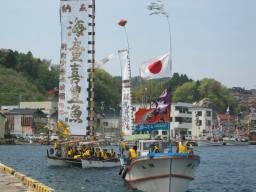 | 能登町の県指定無形民俗文化財「小 木とも旗祭り」は二日、同町小木港を舞 台に始まり、青空の下、巨大なのぼり 旗を立てた伝馬船九隻が港内を勇壮 に巡航した。 |