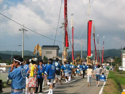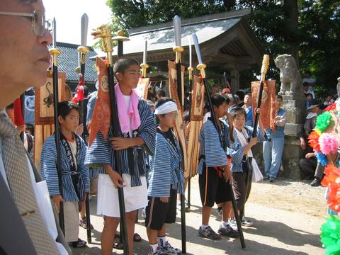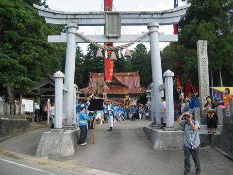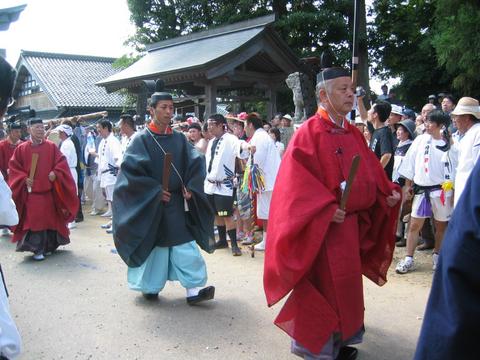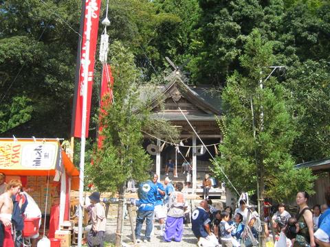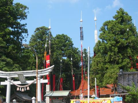 境内にある摂社の薬師社 二)天狗面をつけた猿田彦が鉦、太鼓に 合わせて踊りながら祭りを先導し、屈強 の若い衆が20mもある真紅の枠旗を担 ぐ勇壮な祭り。 |