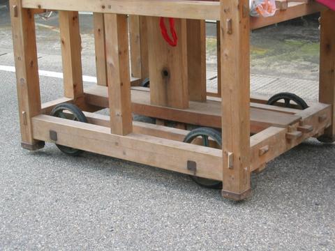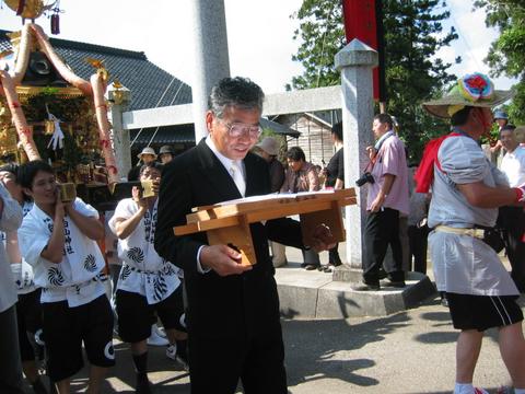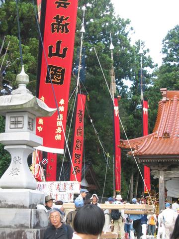 | 森に囲まれた神社で深紅の枠旗 | 「奉幣持ち」 町会長がこの役目を担う | 枠旗の下の台車 |