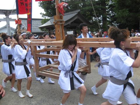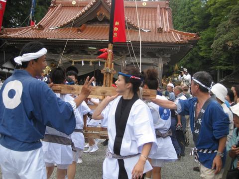 お熊甲祭 08 横田地区では女子禁制の同祭で初めて「女枠旗 」がお目見えし、祭りに花を添えた。 |