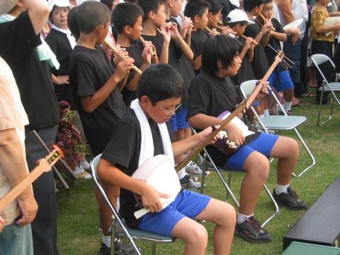 | 能登部上区曳山の「拳打ち」 NO.3 小学生が「拳打ち」の囃子方(三味線、笛)を 弾きます。 |