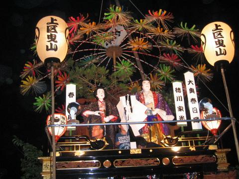 | 能登部上区の曳山 NO.3 夜提灯が点灯されライトアップされた。飾り 人形は徳川家光と春日局(大奥) |