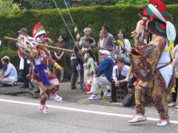 | 石川県七尾市豊川地区の「六保」は 24日、同市豊川町の日吉神社など で行われ、深紅の枠旗8本が神輿と キリコとともに勇壮に町を練った。 |