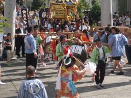 神社の屋根にとどかすキリコ ・・・・高さ約20メートルの枠旗や神輿を豪快に上下に揺らし、見物客が見入った。 |