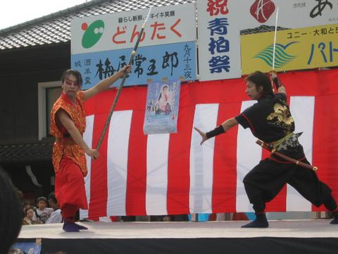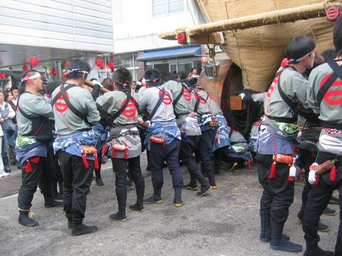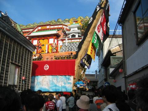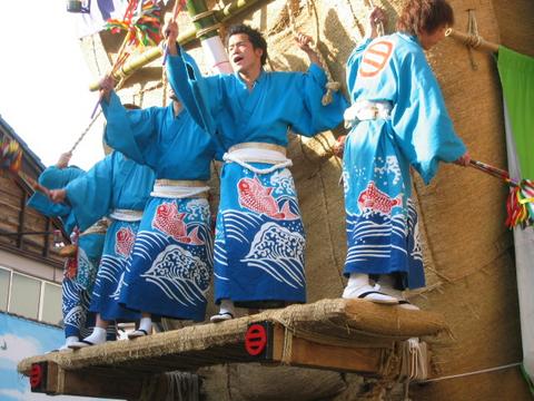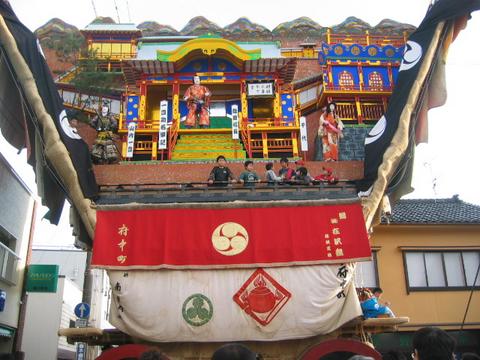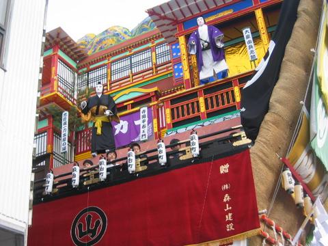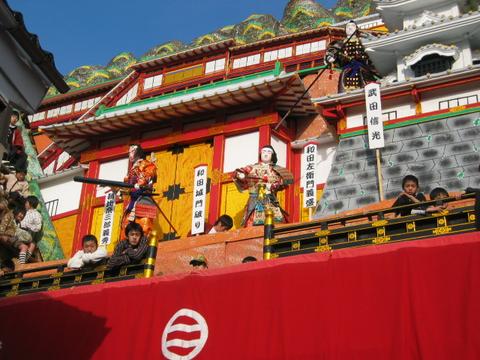| 最今は女性の曳き子も参加 ことしの出し物は、鍛冶町が「仮名手本忠臣蔵 一力茶屋の場」、魚町が「朝比奈 和田 城門 破り」、府中町が「一豊 功名軍記」で、華やか な衣装を身にまとった歌舞伎人形が繰り広げ る歴史絵巻が見物客の心を魅了 |