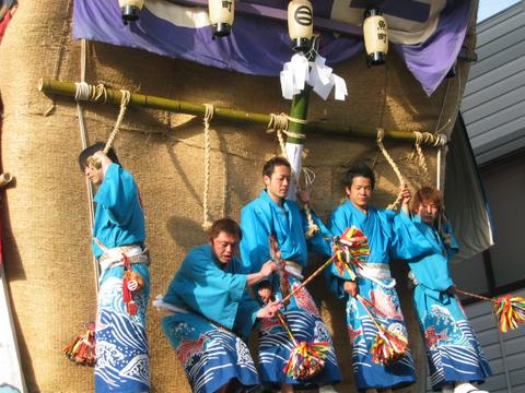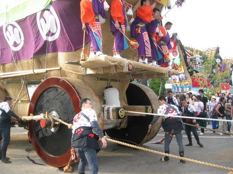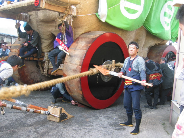 魚町の曳き山 B各町の曲がり角で、梃子(てこ)を使ってでか 山を方向転換する「辻回し」が披露されると、男 衆の妙技に観衆から歓声がわき起こった。 |
