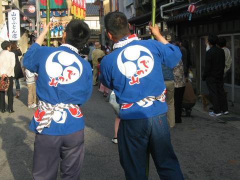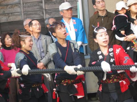 女性の曳き子 D「裏山」の五日は、でか山が能登食祭市場 前と御祓川沿いに再びそろい、三日間の祭り を締めくくる。 |