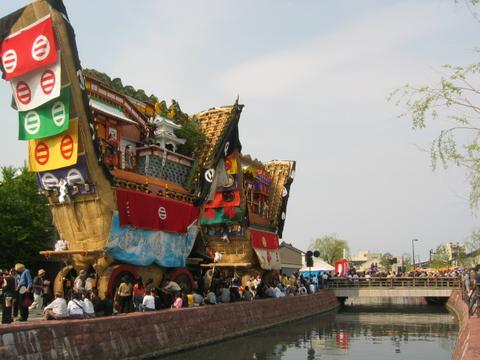 魚町・府中町の曳山(御祓川仙対橋付近) A港町を包む祭りの熱気は最高潮に達した。 三日夜の鍛冶町の宵山(よいやま)に続き、 四日未明に府中町の朝山、同日朝には魚町 の本山が市内に繰り出した。 |