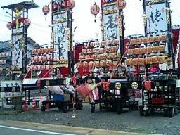 広場に整列した町内4基のキリコ 前日の14日はキリコが町内を練り15 |