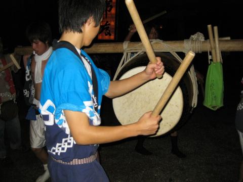 | 藤津比古神社の社旗 | 太鼓 | 整列したキリコ |