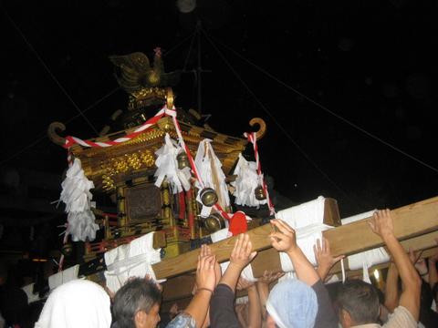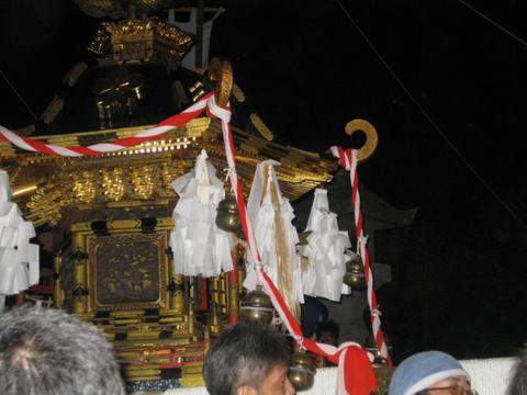 子浦神社の大神輿 二十一日午前零時半過ぎ境内に戻った天 狗と獅子が勇壮な舞を披露した。獅子殺し は同地区の「荒屋新川」と「久保町」の二 地区が一年交代で担当している。 |