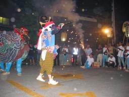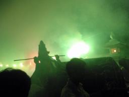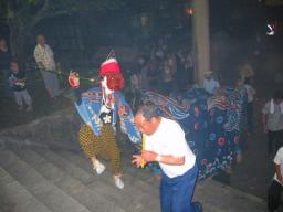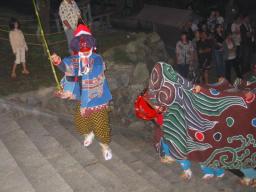 | 獅子舞を舞う回りから「吹き出し花 火」が何本も焚かれた。 |