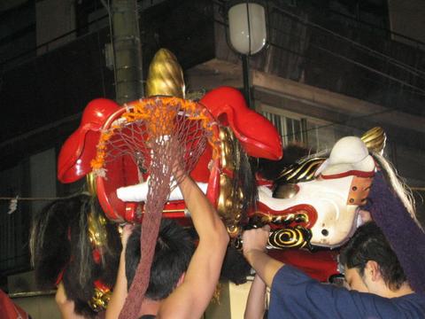 | 「獅子頭合わせ」 一)津幡町津幡地区の秋季祭礼の伝統行事 「獅子頭合わせ」は十七日夜、四町の獅子舞 が同町清水の四ツ角に集結し、若者たちが 獅子頭を合わせて舞を披露した。 |
