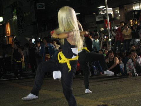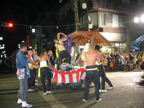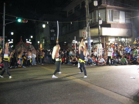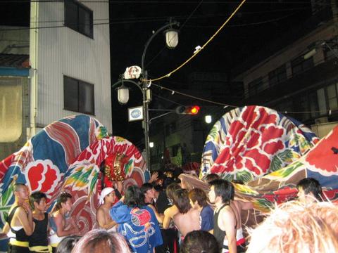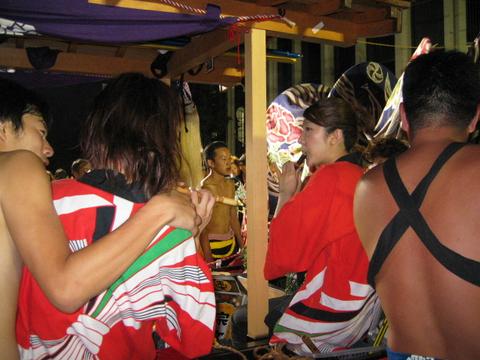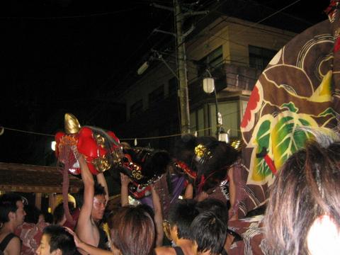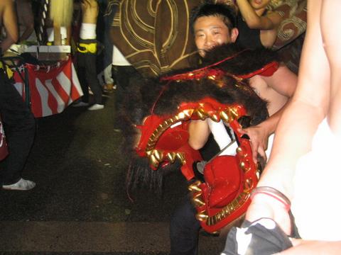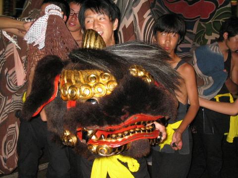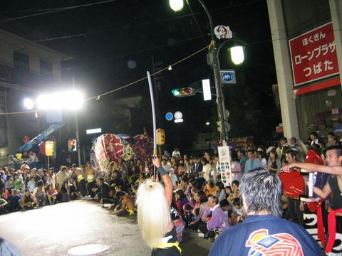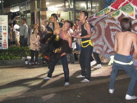 棒振り 二)津幡地区太白会の「けんか獅子」と清水 区八幡会の「熊獅子」、庄区住吉会の「大獅 子」、加賀爪区白鳥会の「赤獅子」が町内を 練り歩いた後、舞囃子とともに四ツ角に繰り出 した。 |