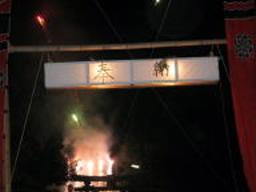 「奉納」の行燈のしたでナイアガラの 花火が点火 |