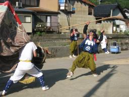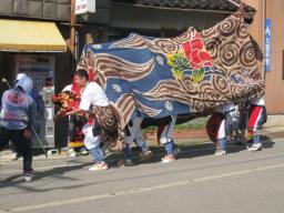 石川県津幡町河合谷地区御山神社秋 祭りには保存会の皆様は伝統の勇壮 な「にらみ獅子」を舞い地区内を回ります |