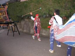 | 能登獅子で中学生が踊っていた。 烏帽子を被らずかわりに赤布を巻いて いた。 |