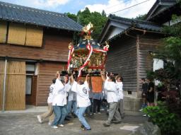 | 「ソラサァセ、ソラサァセ」と掛け声で御輿 を担ぎ |
